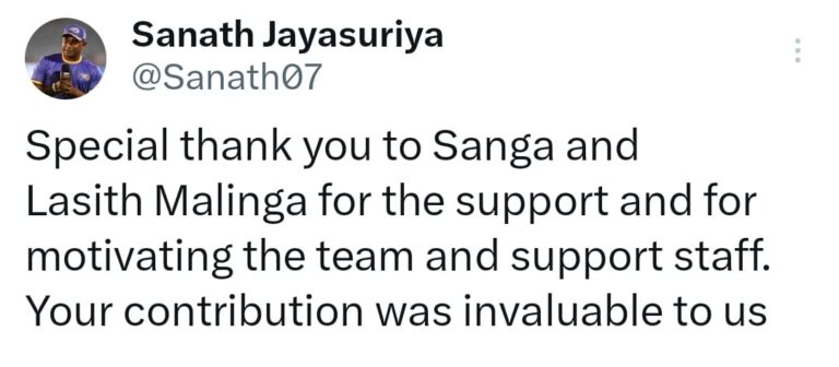 වසර 27කට පසු ඉන්දියාවට එරෙහිව ශ්‍රී ලංකාව ලැබූ පළමු එක්දින තරගාවලි ජයග්‍රහණයෙන් පසු හිටපු ක්‍රිකට් ක්‍රීඩක කුමාර් සංගක්කාර සහ ලසිත් මාලිංග වෙත ශ්‍රී ලංකා පුහුණුකරු සනත් ජයසූරිය සිය කෘතඥතාව පළ කරමින් සිය X ගිණුමේ සටහනක් පළ කර තිබේ.