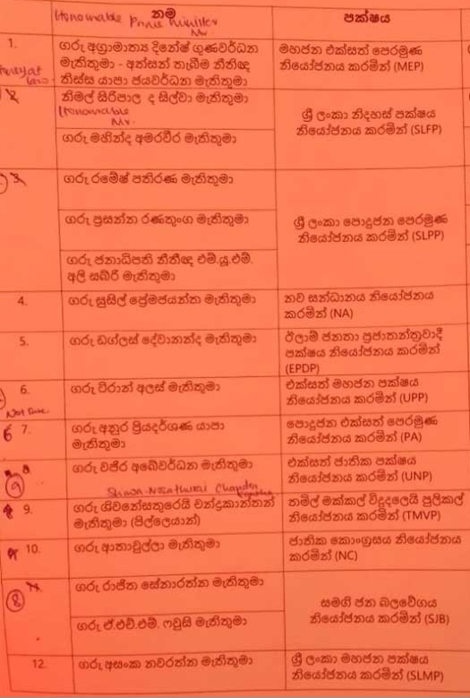 සම්මුතියට අත්සන් තැබූ පක්ෂ හා මන්ත්රීවරුන්ගේ නාම ලේඛනය පහතින්.