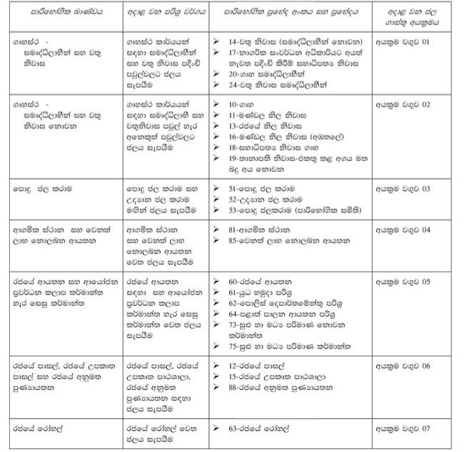සමෘද්ධිලාභීන් සහ වතු නිවාස හැර ගෘහස්ථ කාණ්ඩය, රජයේ පාසල්, රජයේ උපකෘත පාසල් කාණ්ඩය සහ රජයේ අනුමත පුණ්යායතන සහ රජයේ රෝහල් කාණ්ඩය යන අංශ මෙම නව ජල ගාස්තු සංශෝධනයට අයත් කාණ්ඩයන් වෙයි.