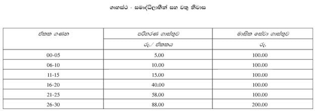 ගෘහස්ථ කාණ්ඩයේ ඒකක 0 සිට 05 දක්වා ගාස්තුව ඒකකයක් රුපියල් 60 සිට 50 දක්වා රුපියල් 10කින් අඩුකර ඇති අතර, ඒකක 76 ත් 100ත් අතර ඒකකයක් සඳහා අය කරන ගාස්තුව රුපියල් 270 සිට 250 දක්වා රුපියල් 20කින් පහත දමා ඇත.