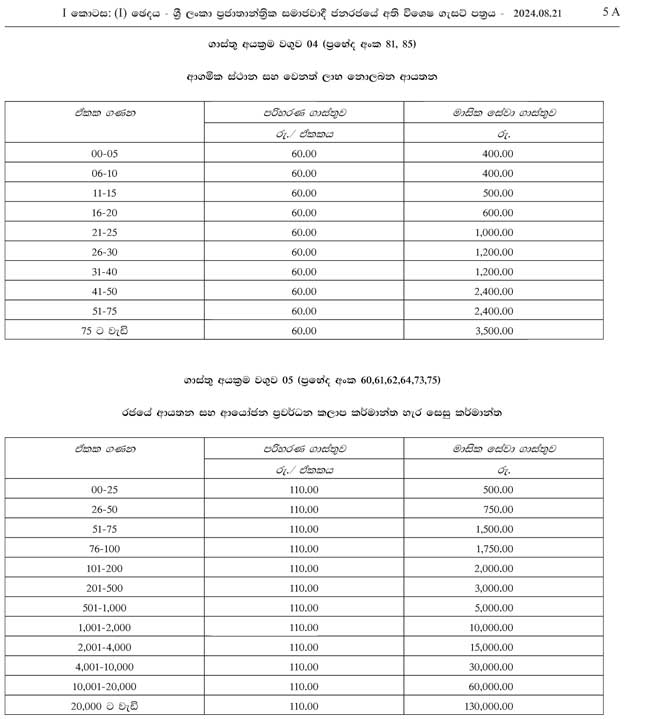 රජයේ සහ රජයේ උපකෘත පාසල් කාණ්ඩය සහ රජයේ අනුමත පුණ්යායතන සහ රජයේ රෝහල් කාණ්ඩය යටතේ සියලු ඒකකයක් සඳහා අය කළ රුපියල් 60ක ගාස්තුව රුපියල් 5කින් පහත දමා ඇති අතර, එහි නව ගාස්තුව වන්නේ රුපියල් 55කි.