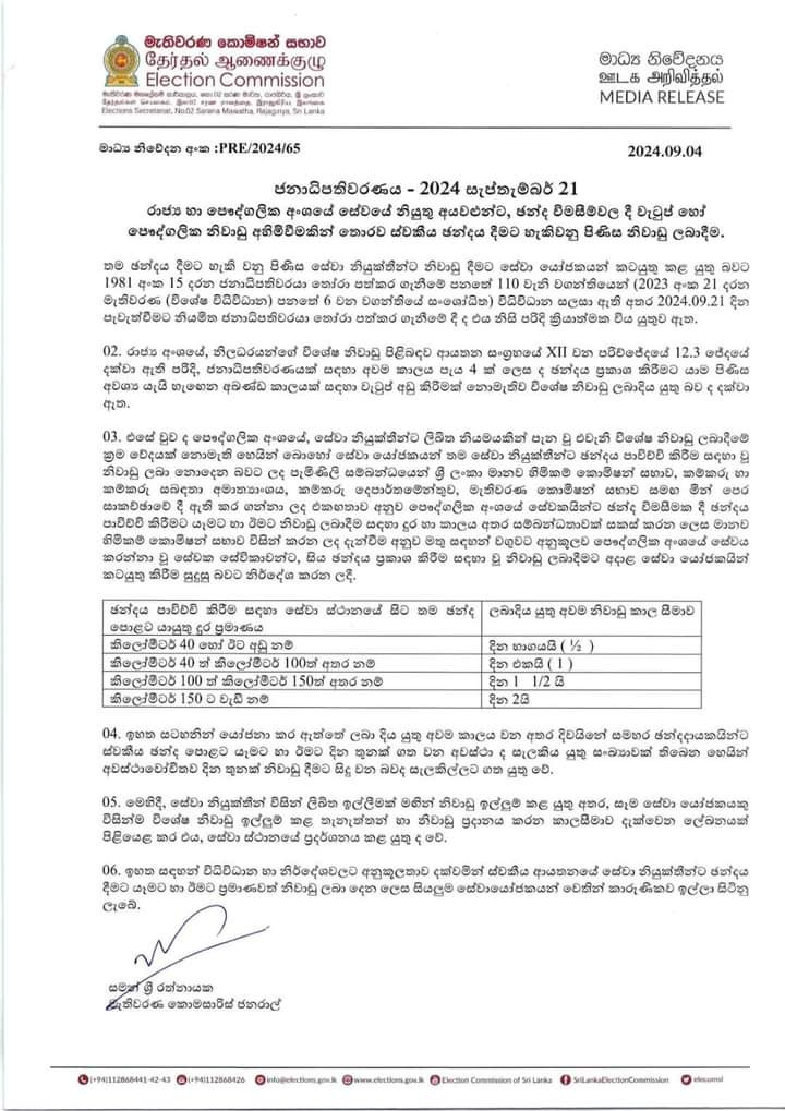 ඒ අනුව, පෞද්ගලික අංශයේ සේවකයින්ට ඡන්දය ප්රකාශ කිරීමට යෑමට සහ ඒමට නිවාඩු ලබා දීම සඳහා දුර හා කාලය අතර සම්බන්ධතාවක් මානව හිමිකම් කොමිෂන් සභාව විසින් සකස් කර ඇත.
