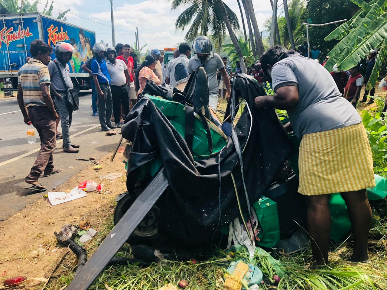ත්රීරෝද රථයේ රියදුරා ඇතුළු එහි ගමන් ගත් තිදෙනාගේ තත්ත්වය බරපතළ වන බවයි අප වාර්තාකරු සඳහන් කළේ.