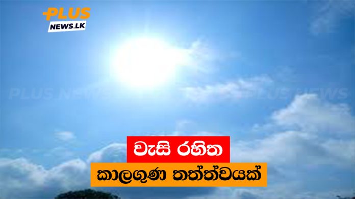 දිවයිනේ බොහෝ ප්රදේශවල ප්රධාන වශයෙන් අද (11) වැසි රහිත කාලගුණ තත්ත්වයක් පවතින බව කාලගුණ විද්යා දෙපාර්තමේන්තුව නිවේදනයක් නිකුත් කරමින් සඳහන් කරනවා.